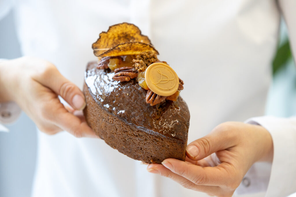 Cake aux épices d’hiver, garnis d’un confit aux agrumes et noix de pécan.